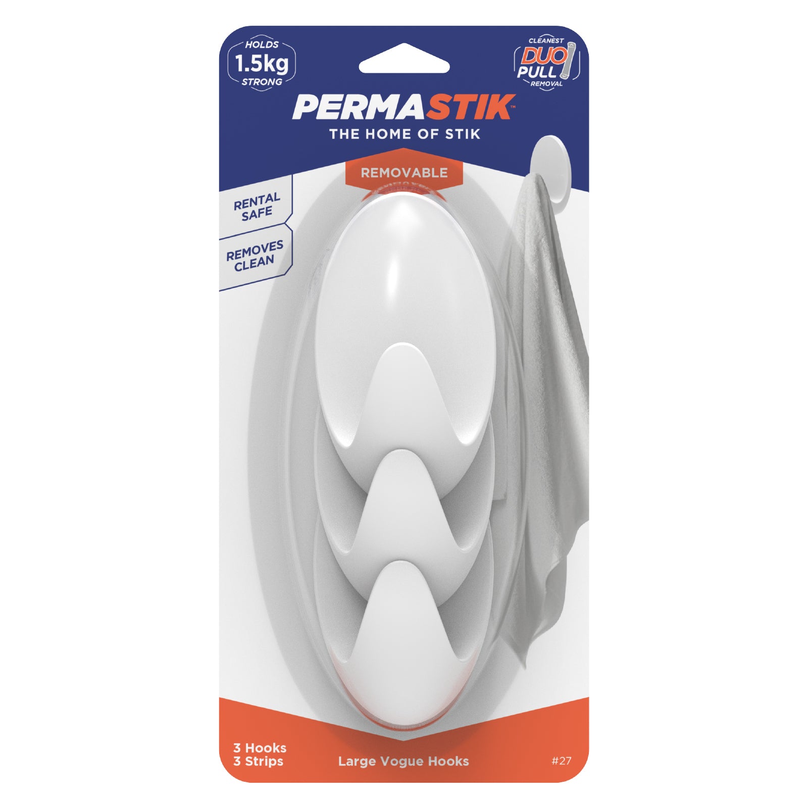 Permastik Large Vogue Hooks are the perfect way to stylishly hang small items in convenient locations in your home. Ideal for rentals, easily remove when no longer needed. The hidden removal tabs add to a clean clutter-free appearance.